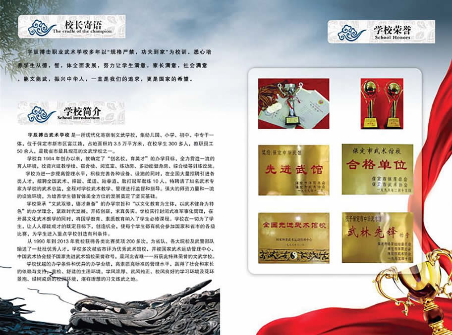 联系我们保定市宇辰武术院招生电话:15031243588 13383229961 报名地址:河北省保定市莲池区天威东路,宇辰文武学校, 保定市宇辰武术院专业设置: (1)套路:A、传统套...